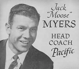 John Melvin "Moose" Myers (October 8, 1924 – December 24, 2020) was an American football player, coach, and college athletics administrator. He played college football at the University of California, Los Angeles (UCLA) and professionally in National Football League (NFL) with the Philadelphia Eagles and Los Angeles Rams.[1] Myers served as the head football coach at the University of the Pacific in Stockton, California from 1953 to 1960, compiling a record of 39–33–5. He was also the athletic director at Pacific from 1956 to 1961.