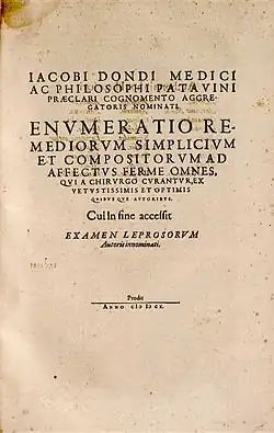 The most celebrated work of Jacopo Dondi is the Aggregator or Promptuarium medicinae ed Enumeratio remediorum simplicium et compositorum, completed in 1355 and conserved in manuscript in the Vatican (Vat. lat. 2462, fourteenth century), the Collegio di Spagna, Bologna (MS 153, dated 1425) and the Bibliothèque Nationale in Paris (Lat. 6973 and 6974). It was published in Strasburg in about 1470 by the "R-printer" (Adolph Rusch) and in Venice in 1481 by Michele Manzolo. It was reprinted in Venice in 1542 by Tommaso and Giovanni Maria Giunta, and again in 1576. The section on surgery, Enumeratio remediorum simplicium et compositorum ad affectus omnes qui a chirurgo curantur, was included in the Chirurgia: de chirurgia scriptores optimi quique veteres et recentiores of Conrad Gesner, printed at Zurich in 1555 by his cousins Andreas and Iacobus Gesner,[3] and in the Thesaurus chirurgiae of Peter Uffenbach (1610).[1][4]