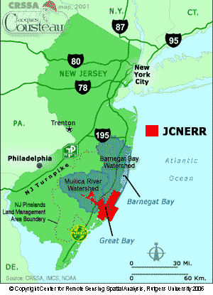 The Jacques Cousteau National Estuarine Research Reserve, located in southeastern New Jersey, encompasses over 116,116 acres (nearly 470 km2) of terrestrial, wetland and aquatic habitats within the Mullica River-Great Bay ecosystem.[1]