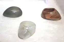 Specially designed 'archer's ring' was worn by an archer in the thumb of the right or left hand at the time of archery. While pulling the string for shooting the arrow, it helped in safe guarding the thumb, so that the string of bow would not damage the fingers. It is made of whitish nephrite jade and dark green jade. It is adorned by floral motifs.