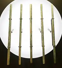 A set of five jade tubes, with the length of 29 cm, were unearthed in the Peinan Site and are now collected in the National Museum of Prehistory. They can be dated back to 2,800 to 2,300 years ago (2,800–2,300 B.P.; or 850–350 BC) and came from the slate coffins. The five tubes were in a bundle and placed by the tomb’s owner. This set of jade tubes is polished well and in the same specification. Compared with other jade ornaments of the same type unearthed in other archaeological sites in eastern Taiwan and nearby countries, this set of jade tubes is the longest one, displaying the masterfulness and world-class uniqueness of the jade craftsmanship in Neolithic Taiwan. It was designated as a national treasure by the Ministry of Culture in 2012.[2]