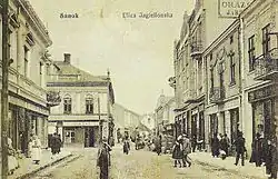During the Galician autonomy in the late 19th and early 20th centuries, the street was predominantly inhabited by Jewish residents.[7] Before 1906, the Sanok Beautification Society planted 80 linden trees along the street.[8] Over time, commercial establishments and shops, previously concentrated around St. Michael's Square and the Market Square, began to appear along Jagiellońska Street.[9] As Tadeusza Kościuszki and Jagiellońska Streets became national roads, they faced challenges due to increased traffic in the city center.[10] A particular difficulty was the steep incline near the Old Jewish Cemetery, known as Okopisko. In 1937, the street was widened.[11]