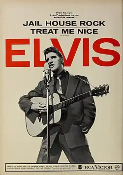 The single, with its B-side "Treat Me Nice" (another song from the film's soundtrack) was a US number one hit on the Billboard Hot 100 for seven weeks in the fall of 1957, and a UK number one hit for three weeks early in 1958.[6] In addition, "Jailhouse Rock" spent one week at the top of the US country charts,[7] and reached the number one position on the R&B charts.[8]