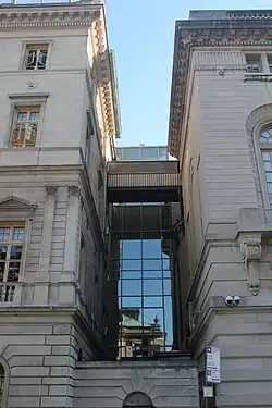 The fourth story included five bedrooms and a children's playroom, while the attic had an infirmary.[22] There were also various closets and bathrooms on the fourth story.[36] The first through third stories are connected to the Kahn House's rear rooms via a glass passageway that is set back from the street. Since the floor levels are uneven, the connection is slightly sloped. The top stories, originally used as bedrooms and living spaces, are used as the Convent of the Sacred Heart's offices and classrooms.[26]