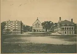 View across a quadrangle of three buildings at Brown University. The buildings are each constructed in a different style, including a large brick building with many windows on each story, a stone hall with a peaked roof (Sayles Hall), and a stone and brick building with a corner tower and a second story porch.