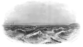 On 2 December the Peacock departed for the Pacific Northwest.[27] It reached the mouth of the Columbia River on 17 July 1841. In the afternoon of the following day Hudson ordered the Peacock to cross the Columbia Bar. Unfortunately, the Peacock soon hit a shoal and proceeded to be battered by the current. After struggling to keep it afloat throughout the night, the crew was rescued the following morning. The Peacock was soon destroyed thereafter.[28]