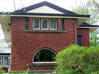 The James F. Clarke House is a historic building located in Fairfield, Iowa, United States. This Prairie School house was built for Dr. Clarke in 1916. It was designed by Francis Barry Byrne, a student of Frank Lloyd Wright. Byrne was a part of the Prairie School until its demise, and this house shows his movement away from its formal expression, but not its ideals.[2] The two-story brick structure is capped with a low-pitched gable roof. It follows the idiom's use of open and flowing plans, but deviates in its use of simpler decorative forms and De Stijl-like colors.[2] The windows, doors and baseboards are all plain and flat. Clarke was one of the first people in Jefferson County to own an automobile, and the house has one of the first attached garages. It was listed on the National Register of Historic Places in 1980.[1]