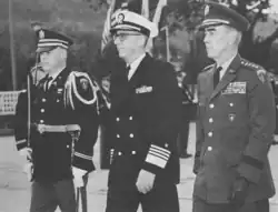 Polk (right) welcoming Admiral Waldemar F. A. Wendt (center) to Seventh Army and USAREUR Headquarters in Heidelberg, Germany in 1968.