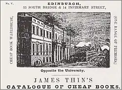 Trade continued to improve and Thin was soon advertising the business as "the largest retail bookselling establishment in Edinburgh".[5] In 1854, he issued his first catalogue of second-hand books.[4] In 1864, the shop was extended into 15 Infirmary Street, a former tavern.[4]: 6–7