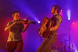 Jamie Smith's Mabon predominantly performed purely instrumental music, although they also had many songs with vocals. Nearly all of their music was their own composition, predominantly created by Jamie Smith and reflecting their varied interests and influences based in traditional or contemporary Celtic music, but also reaching into world music and beyond.[13][9] Their ability to seamlessly blur "the boundaries between the heritage of a traditional Celtic legacy and a more contemporary sound" has been noted,[2] as has their "wide dynamic range, from quiet, reflective melodies and songs to loud and exciting music."[16] Amongst the latter are tunes such as "The Accordionist's Despair", an incredibly difficult piece, described as "... an unholy union of Bach and Metallica."[2]