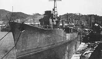 Kashi arrived in Takao, Taiwan, on 7 January 1945 and was moderately damaged by American aircraft on 21 January. The ship was able to reach Hong Kong two days later and then escorted a convoy from Shanghai to Moji on 2–7 February. She continued onwards to Sasebo, Japan, where she was docked for permanent repairs. On 5 February Escort Squadron 31 was transferred to the Combined Fleet. The ship arrived at Kure on 14 March and remained in the Seto Inland Sea for the rest of the war. The squadron was reassigned to the Second Fleet from 15 March to 20 April and then rejoined the Combined Fleet. Kashi was lightly damaged during the attacks on Kure and the Inland Sea in July. She was turned over to Allied forces at Kure at the time of the surrender of Japan on 2 September and was stricken from the navy list on 5 October.[9] The destroyer was disarmed and used to repatriate Japanese personnel, operated by Japanese personnel under Allied control. After the conclusion of the repatriation mission in 1947, the ship was turned over to the United States on 7 August and scrapped by Kasado KB in Kobe, Japan,[5] beginning on 20 March 1948.[11]