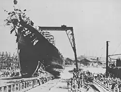 The Shiratsuyu-class destroyers were modified versions of the Hatsuharu class, and were designed to accompany the Japanese main striking force and to conduct both day and night torpedo attacks against the United States Navy as it advanced across the Pacific Ocean, according to Japanese naval strategic projections.[3] Despite being one of the most powerful classes of destroyers in the world at the time of their completion, none survived the Pacific War.[4] Murasame, built at the Fujinagata Shipyards in Osaka was laid down on 1 February 1934, launched on 20 June 1935 and commissioned on 7 January 1937.[5]
