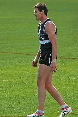 Jason Blake (born 15 March 1981) is a former Australian rules footballer for the St Kilda Football Club in the Australian Football League (AFL). An "undersized tall defender and occasional ruckman",[1] he held the record for the most games played (209) without receiving any Brownlow Medal votes until he eventually received two Brownlow votes for Round 11 in 2012. The record was subsequently beaten by Nick Smith.[2]