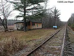 Jayville was a hamlet located in the southwest part of St. Lawrence County, New York, in the United States. The hamlet started as a mining community in 1850 on what eventually became the Carthage and Adirondack Railroad.[1] Its existence was short lived as its non-favorable mineral composition and difficult ore availability was abandoned in favor of neighboring Benson Mines, located 14 miles (23 km) down the railroad to the east.[2] After mining stopped in the community, other industries such as saw mills kept the population busy. Ultimately, these business were short lived. A further attempt to reopen the mines in 1914 failed and an eventual fire ended the existence of the hamlet of Jayville.[3] Today remnants of the hamlet can be found off the now abandoned railroad station located on New York State owned land[4] southeast of Harrisville on Jayville Road.