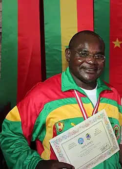 Jean Marc Ndjofang (born 15 March 1976 in Ebolowa[2]) is a Cameroonian draughts player,[3][4] resident since 2002 in the Netherlands. He was African champion in 2000 and 2010.[5] In 2011 at the Draughts World Championship he took third place.[6] In 2013 he placed second at the Draughts World Championship.[7] In 2015 he played the World Draughts Championship match with Alexander Georgiev from Russia.[8]