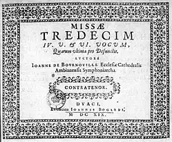 The same collection indicates him at that time as master of the children of the collegiate church of Saint-Quentin.[2] In 1613 Bournonville offered to the chapter of the Cambrai Cathedral a bound collection of his masses (probably the Parisian editions of Pierre I Ballard).[3] He remained in Saint-Quentin until about 1618.[4]