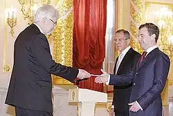 ![]() de Gliniasty presenting his credentials to Dmitry Medvedev in May 2009 | |
