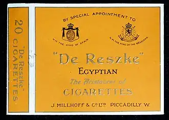 Reszke enjoyed smoking cigars, but found that doing so affected his singing. He tried a number of cigarettes, but found that they were problematic too. Jacob Millhoff, a Russian cigarette manufacturer and fan who settled in London, developed a tobacco that would not damage his voice. Out of gratitude, Reszke allowed for them to be marketed under his name.[35]