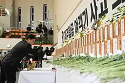 The government declared Muan a special disaster zone and issued a period of national mourning until 5 January 2025.[26] It also set up 90 memorial altars in 17 cities nationwide for public displays of grief,[110] with attendance estimated to have reached nearly 158,000.[111] Acting president and acting prime minister Choi Sang-mok, who acceded to the presidency two days before the accident following his acting predecessor Han Duck-soo's impeachment, ordered rescue efforts[112] and emergency benefits for relatives of the victims.[113] In under two hours, the Ministry of the Interior and Safety activated its Central Disaster and Safety Countermeasures Headquarters (중앙재난안전대책본부). Two days after the accident, Ko Ki-dong, the acting interior minister, visited Muan.[114] Korail announced a dedicated KTX train service, departing from Seoul for Mokpo at 3:00 p.m., free of charge for the family members of the passengers to reach Muan airport.[115][116] The Gwangju Bar Association created a legal support task force to assist those affected by the disaster.[117] Messages of sympathy and ritual offerings were left by passersby in the perimeter fence of Muan airport.[118] The flag at the Thai embassy in Seoul was set at half-mast in mourning for the victims.[25]