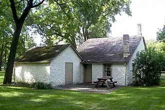 The house is a two-story building with 18-inch (0.46 m) thick walls of Milwaukee County limestone and stucco. It is about 24.5 feet (7.5 m) by 19 feet (5.8 m) in plan. The house was restored in the 1930s in a Works Project Administration project but later was vandalized heavily. It was acquired by the Milwaukee County Historical Society in 1952.[3]