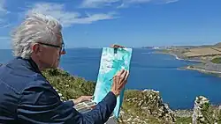 Gardiner seeks to capture the environmental processes that shape the surface of the earth and his vision of landscape reflects the genius loci or sense of place of his subjects.[12] His artworks have been compared with those of Paul Nash and Graham Sutherland.[13] His paintings are the product of a long engagement with coastal landscapes in Britain.[14] He has continued the approach to landscapes of 20th-century St Ives modernist artists such as Peter Lanyon, Ben Nicholson, and John Tunnard.[10] Gardiner's landscape subjects have included locations from the Jurassic Coast,[15][16] especially in Dorset, and the coastline of Cornwall,[17] in southern England.