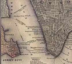 1847 map of Paulus Hook and the Jersey City Ferry's route. Note the historic name of Pavonia.