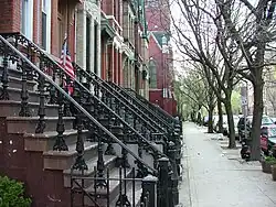 On April 12, 1841, the New Jersey Legislature incorporated Van Vorst Township from portions of Bergen. Land was donated by the Van Vorst family for a town square style park that became Van Vorst Park. The township was later annexed by Jersey City on March 18, 1851.[85] From 1854 to 1874, the kitchen step of the Van Vorst Mansion, home of former mayor Cornelius Van Vorst (1860–1862), was known to be the slab of marble that was originally the base of the statue of King George III that was toppled by the Sons of Liberty at Bowling Green in Lower Manhattan in 1776.[86][87] Van Vorst also constructed the neighboring Barrow Mansion where his sister Eliza lived.