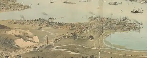 Soon after the Civil War, the idea arose of uniting all of the towns of Hudson County east of the Hackensack River into one municipality. In 1868, a bill for submitting the question of consolidation of all of Hudson County to the voters was presented to the Board of Chosen Freeholders (now known as the Board of County Commissioners). The bill was approved by the state legislature on April 2, 1869, with a special election to be held on October 5, 1869. An element of the bill provided that only contiguous towns could be consolidated. While a majority of the voters across the county approved the merger, the only municipalities that had approved the consolidation plan and that adjoined Jersey City were Hudson City and Bergen City.[95] The consolidation began on March 17, 1870, taking effect on May 3, 1870.[96] Three years later on February 4, 1873, the present outline of Jersey City was completed when Greenville Township agreed to merge into the Greater Jersey City.[67][97]