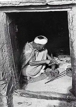 While sedentary life had flourished since prehistorical times, survival in the drier regions, and especially in the High Atlas and Anti-Atlas mountains, was only possible if people moved with their cattle to the higher mountain regions, where grass, herbs and above all water were still available in sufficient quantity. As they did not return to their villages until late autumn, their winter harvests were stored in a fortified communal granary, called agadir, and protected against other nomads and hostile neighbouring villages by guards, who stayed there at all times. This regime was also followed in the Aures region of Algeria, where local clans stored grains in fortified granaries. [7] In villages and small towns of Morocco, people often lived in traditional buildings called ksour (pl.).[8] In most settlements, blacksmiths and silversmiths operated small, family-run workshops.[9] Based on their skills of handling the four elements: fire, air, water and metals, originally taken from the earth, these professions were often not highly regarded, which was partly due to superstitious beliefs attributed to these skills.[10]
