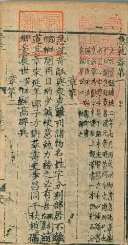 Jíjiù has several possible interpretations, depending on the meanings of jí 急 "urgent; hurrying; rapid; fast; hasty; distress" and jiù 就 "proceed; advance; accomplish; achieve; accomplish; finish". The Science and Civilisation in China collaborators Joseph Needham, Lu Gwei-djen, and Huang Hsing-Tsung say, "One hardly knows how to render its title, unless 'Handy Primer'."[2] Thomas Lee translates jijiu as "quickly getting to".[3] The Chinese lexicographers Heming Yong and Jing Peng say that jijiu 急就 "instant success" suggested "fast learning", as seen in the first words of the Jijiupian preface.[4]