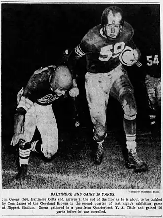Owens played college football at the University of Oklahoma from 1946 to 1949, under head coach Bud Wilkinson, where he was a teammate of Darrell Royal, who, coincidentally, was the Huskies' head coach in 1956, then took the same post at Texas, allowing Owens to come to Seattle.[1] He played a year of pro football in 1950 for the Baltimore Colts, a one-win squad worthy of mention as among the worst teams in NFL history.[2]