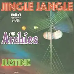 "Jingle Jangle" is a song written by Jeff Barry and Andy Kim, produced by Barry[2] and recorded by The Archies, a fictional bubblegum pop band from Archie Comics.[3] It was released as the group's fourth single on the Kirshner Records label in November 1969, and included on their third album, Jingle Jangle.[4] It reached number 10 on the Billboard Hot 100 and number 27 on the U.S. Easy Listening chart in 1969.[5] In January 1970, it went to number 1 for one week in Canada.