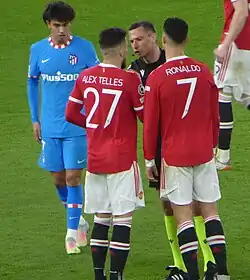 Félix missed Atlético's first three matches of the 2021–22 season, as he continued to rehabilitate from the ankle injury he had been suffering since November.[67] He made his return from injury on 12 September, replacing Antoine Griezmann in the 58th minute in a 2–1 away victory against Espanyol.[69] On 18 September, Félix was sent off in the 78th minute in a 0–0 home draw against Athletic Bilbao, for calling the referee "crazy", leading him to receive a two-match ban.[70] Félix began regaining his place in the team, following his performances in Atlético's next three matches, creating both of Atlético goals, in a 2–0 home victory in La Liga against Barcelona on 2 October, as well assisting Antoine Griezmann second goal in a 2–3 home defeat against Liverpool in the Champions League on 19 October and assisting Luis Suárez first goal in a 2–2 home draw against Real Sociedad in La Liga on 24 October.[71][72][73] He would score his first goal of the season on 31 October, in a 3–0 home win against Real Betis.[74] For his performances in October, Félix was awarded Atlético Madrid Player of the Month by the club's supporters.[75]