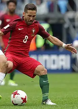 After six appearances out of a possible seven to help his nation win the European Championships for the first time ever,[70][71] Moutinho was also picked for the 2017 FIFA Confederations Cup squad by Fernando Santos.[72] In the latter competition, in the final group stage game in Saint Petersburg, he won his 100th cap by playing the full 90 minutes in the 4–0 defeat of New Zealand.[73][74]