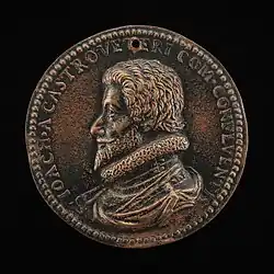 Joachim de Châteauvieux, baron de Verjon puis comte de Confolant (c. 1545c. 1615)[1] was a French governor, military officer, royal guard and favourite, during the French Wars of Religion and early Seventeenth-Century. Born into a noble family from Bresse with a history of royal service, Châteauvieux came to the attention of the royal family during the siege of La Rochelle in 1573, part of the fourth French War of Religion. The siege was led by the king's brother Anjou, and after Anjou was elected as king of the Commonwealth, Châteauvieux travelled with him to his new kingdom, serving as a member of his household during his brief reign there before he returned to France as Henri III. Back in France, Châteauvieux was again made a member of the king's household. In 1578, the king's long serving captain of the Scots Guard died, and Henri chose Châteauvieux for the prestigious post. In the following years he received both of the royal orders, that of Saint-Michel and Saint-Esprit.