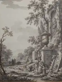 At Strawberry Hill House, Walpole employed Müntz for four years as a painter and engraver. He also recommended Müntz as a designer to friends including John Chute and George Montagu.[5] Müntz worked for some time at Chute's residence, The Vyne near Basingstoke, where some of his paintings remained.[2] He was at The Vyne in September 1756, when the poet Thomas Gray found it fell to him to nurse Chute through a severe attack of gout.[6]