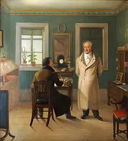 In 1827, Duke Karl August had seen a painting by Albrecht Dürer (The Crucifixion of Christ) and was looking for an artist to make a copy. He asked Goethe, who recommended Schmeller. After the publicity surrounding that project, Schmeller began to receive numerous portrait commissions from the Weimar bourgeoisie. The Duke died in 1828, but a visit from the physician and painter, Carl Gustav Carus led to major commissions from the "Gesellschaft Deutscher Naturforscher und Ärzte" (Society of German Natural Scientists and Doctors). In 1836, on their behalf, he went to Jena, where he produced portraits of notable members, including Christian Ehrenberg, Hinrich Lichtenstein, Heinrich Göppert, Johann Heinrich von Mädler and Joseph Johann von Littrow.