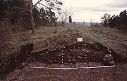 A few late Neolithic finds probably only testify to a short-term use of the spur in this period. In the late Bronze Age and early Hallstatt period (HaB2 to HaC1) the spur was sealed off from the plateau for the first time with a sectional hillfort. The fortification, the remainder of which was preserved in the western hillfort, consisted of a wooden-reinforced fill of stream limestone, which was quarried on the uppermost valley level of the Pennickental, about 80 m below the plateau. Simon calculated that about 150 m³ of wall backfill had to be brought to the plateau by the builders. In front of this wood-earth-stone construction was a stone facing wall made of foamed lime blocks or slabs in dry construction, which probably originated mainly from a shallow material extraction trench directly in front of the wall. The back front was probably not designed as a ramp, as Neumann assumed, but apparently consisted of a wooden (plank) wall that later tilted inward.[12]