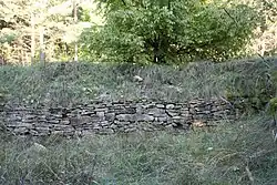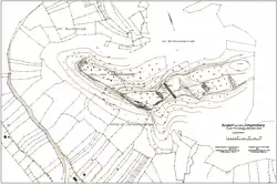 On the southern edge of the plateau, from the southern end of the western hillfort to the edge in the west, an approximately 35 m long, much lower hillfort has survived. A sketch from 1884 and a drawing from 1912 also show a hillfort at the transition from the trapezoidal plateau to the spur, where today only a clear terrain edge can be seen.[4] According to the older plan, the plateau was even surrounded by hillforts on all sides. Probably the low hillfort is the remainder of an edge fortification, which was preserved on the somewhat less rugged steep slope to the south here.