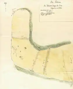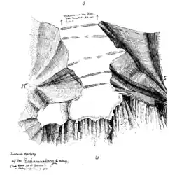 The existence of two further hillforts in the east adjoining apron is unclear. These are described in the older local history literature of the 1920s and 1930s[5] and are also recorded on the two drawings. While they are not mentioned in various publications by the excavator Gotthard Neumann in 1959 and 1960, Reinhard Spehr in 1994 spoke of a "straight line(s) of the two forewalls that had been overlooked so far."[6] The entire area today has been heavily reshaped by extensive reforestation since the 1950s. Further encroachments were probably made by entrenchment works in connection with the foot drill and Manöverplatz of the Jena garrison, which was used until the First World War. Without archaeological investigations it cannot be decided whether the relatively flat and rather irregular ground undulations and incisions to the east of the two hillforts mentioned are natural, geological phenomena or actually artificially created or at least expanded fortifications.[7] In the latter case, the site would be considerably enlarged once again.