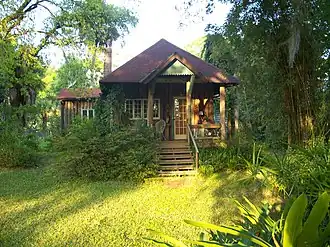 The John Anderson Lodge was an historic home built around 1886 at 71 Orchard Lane in Ormond Beach, Florida, United States. It was built for Ormond Beach promoter John Anderson (1853–1911), who was one of the first owners of the Ormond Hotel. The lodge was originally used by employees of the hotel and to host parties. In its later years it became a single family residence.[3] The lodge was built in the Adirondack Rustic architectural style on pilings and featured vertical palm tree wall construction. Palm trees are typically inappropriate for building construction due to their soft and fibrous consistency. The designers of the lodge used native Florida materials to blend into the context of the local natural environment.[4]