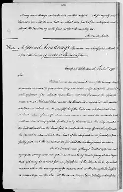In 1756, he led the Kittanning Expedition.[9][10] In 1758, Colonel Armstrong led 2,700 Pennsylvania provincial troops on the Forbes expedition, the approach of which compelled the French to vacate and blow up Fort Duquesne.[11] Armstrong became a good friend to the other militia commander in this expedition, Colonel George Washington.[8]