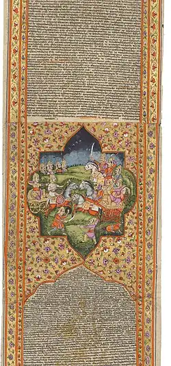 The god Krishna acts as a charioteer to Arjuna in the battle of the Bhagavad Gita, a section of the Mahabharata. Taken from an illustrated manuscript scroll, 1795 C.E., which previously belonged to John Baillie but is now held in the archive collection at the University of Edinburgh, Scotland.