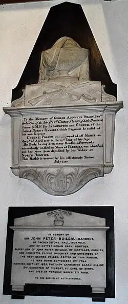 His wife died in 1862 and Boileau survived her until 1869, having suffered on chronic bronchitis in his last years.[4] Sir John died on 9 March 1869 at Torquay and was buried in the family's vault in Ketteringham.[4] His oldest son John having predeceased him in 1861, he was succeeded in the baronetcy by his second son Francis.