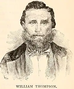 † William Thompson, 26, mortally wounded during the raid[38] William Thompson, from North Elba, New York, was brother of Adolphus. They were brothers of Henry Thompson, who was married to Ruth, John Brown's eldest daughter.[7]: 7 First buried in one of two unmarked boxes near Harpers Ferry; re-interred in 1899 in a common coffin in North Elba.