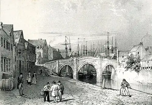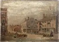 John Chubb's topographical work shows Bridgwater streets and buildings, and his portraits are of his family and local worthies. A number of the paintings feature pretty girls in ornate hats.[24] His portraits of tradesmen and craftsmen include their tools, rather like the Books of Trades of earlier centuries. There are more portraits than topographical paintings. Some time in the early C19 lithographic prints were made of about a dozen of his paintings of Bridgwater scenes, and these are fully represented in the Museum's collection. They were probably by his grandson, John Chubb the younger, also a talented artist. A letter (in the Chubb MS in the Somerset Record Office) which he wrote to his father, Morley, in 1835, mentions him having drawings reproduced as prints by Charles Joseph Hullmandel, the foremost lithographic printer of the time.