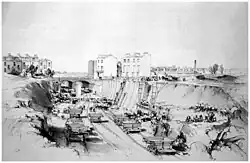 When in the early 1830s near his home the construction started for the London and Birmingham Railway, the first main-line railway to enter London, this became Bourne's major source of inspiration. In 1836 Bourne started making drawings of the construction sides as subjects of professional study. These drawings were published in 1838/39 in a book in four volumes, with an accompanying text by John Britton. Late 1840 he lithographed some drawings for Robert Hay's publication, entitled Illustration of Cairo. Bourne continued to draw railway scenes, and in the 1840s became associate with Charles Cheffins[5] In 1846[4]