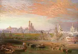 Bourne kept working in Russia as artist in residence for another decade. In the year 1852 he travelled together with Roger Fenton to Moscow and St Petersburg,[9] which resulted in his painting of the Moscow Kremlin (see image). He stayed in Russia in total for a period of twelve years as illustrator and photographer, before returning to England.