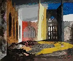 After the bombing raids of 24 November 1940 on Bristol, Piper arrived in the city a day, or possibly two, later. Piper only spent a few hours in the city, but his sketches resulted, by January 1941, in three oil paintings of ruined churches: St Mary-le-Port, Bristol, The Temple Church and The Church of the Holy Nativity.[15] Piper also painted bombed churches and other buildings in London and Newport Pagnell, and also spent a week painting in Bath after the Bath Blitz air raids in April 1942.[12][16] During the summer of 1941, Piper featured in a group exhibition with Henry Moore and Graham Sutherland at Temple Newsam in Leeds. The show was a great success, attracting some 52,000 visitors before touring to other English towns and cities.[2]