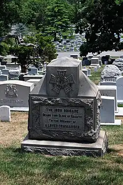 At the end of the council of war on the night of July 2, army commander Maj. Gen. George Meade took Gibbon aside and predicted, "If Lee attacks tomorrow, it will be on your front."[9] Meade's prediction proved correct; Gibbon's division bore the brunt of Pickett's Charge on July 3, where Gibbon was again wounded.[10] While recovering from his wounds, he commanded a draft depot in Cleveland, Ohio, and attended the dedication of Soldiers' National Cemetery in November 1863 with his close friend and aide Lt. Frank A. Haskell.[11]